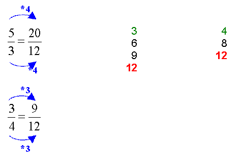 Ebben az esetben egyik tört sem egyszerűsíthető. Írjuk egymás mellé a két nevezőt, és próbáljunk mindkét törtnek új nevet keresni! Az új név a nevezők többszörösei közül kerül ki, tehát mindkét számnak keressük a 2-szeresét, 3-szorosát, 4-szeresét…….stb, méghozzá úgy, hogy először mindig a kisebb kapjon új nevet! (Ezt a névadást később úgy nevezzük, hogy megkeressük a legkisebb közös többszöröst. Ha valaki ezt fejben, ügyesen meg tudja már keresni, akkor nem kell ragaszkodnia ezekhez a formaságokhoz, de kezdetben hasznos módszer lehet.)