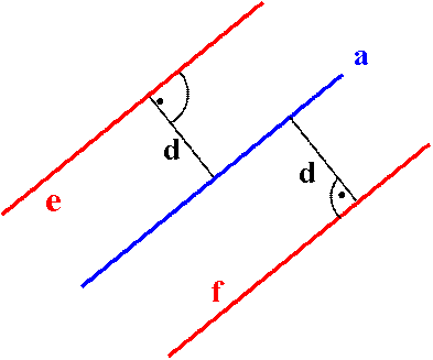 Az e és f egyenesek minden pontja d távolságra van az a egyenestől. Minden olyan pont, amely az a egyenestől d távolságra van a síkon az  e és f egyeneseken van.